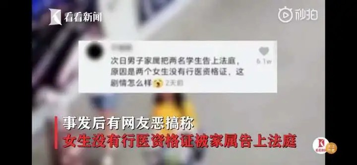 随着视频的广泛传播,一段评论也引起了大家的热议:“次日男子家属把两名学生告上法庭,原因是两个女生没有行医资格证,这剧情怎么样?”