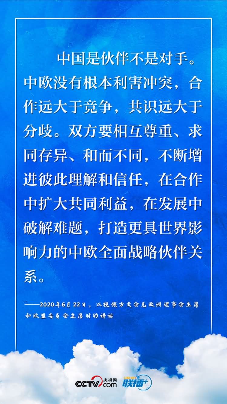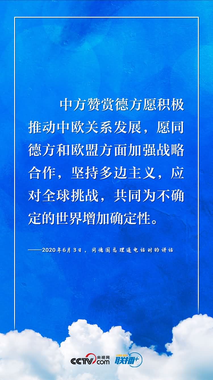 9月14日,习近平主席将以视频方式同德国总理默克尔、欧洲理事会主席米歇尔、欧盟委员会主席冯德莱恩共同举行中德欧领导人会晤。《联播+》梳理今年以来习近平主席与德国、欧盟领导人“云外交”的部分讲话,与您共同感受团结合作中蕴藏的深远意义。