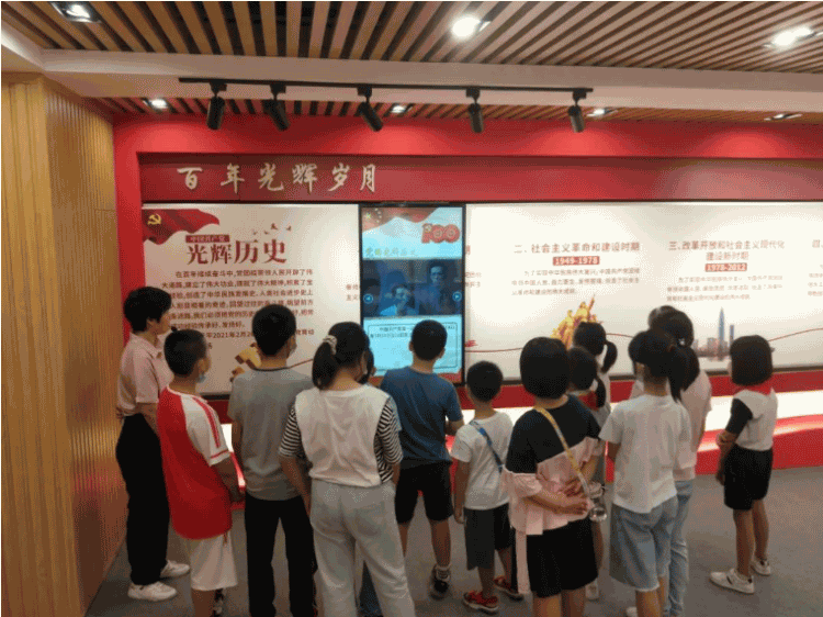 接着,工作人员带领孩子们参观党建教育基地,深入学习党史知识,感受党的光辉历程,回顾中国共产党从无到有、从小到大、带领大家奋斗美好未来的历程,在孩子们幼小心灵播下红色的种子,增强孩子们的爱国情,让“强国复兴有我”的信念在孩子心中生根发芽。
