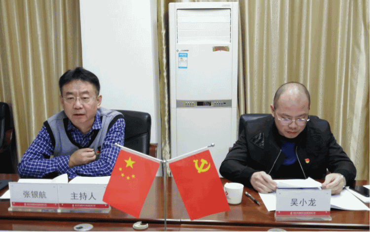 图为集团公司党总支部书记、董事长张银航主持会议,市委主题教育第四指导组吴小龙同志到会指导