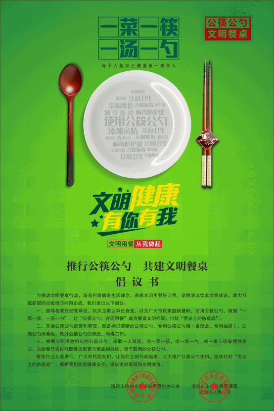公筷公勺、举手之劳,改变旧习、减少病扰。文明用餐从我做起,从现在做起。让我们积极行动起来,倡导用餐新风尚、养成健康好习惯,共建文明清远,共享清远文明。