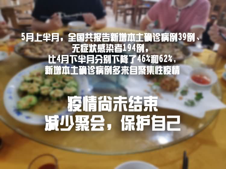 5月上半月,全国共报告新增本土确诊病例39例、无症状感染者194例,比4月下半月分别下降了46%和62%。但新增本土确诊病例多来自聚集性疫情,多地发现无症状感染者,要加强患者救治和流行病学调查,提高核酸检测能力,做好对无症状感染者的筛查、复核和隔离管理,坚决防止疫情扩散蔓延。