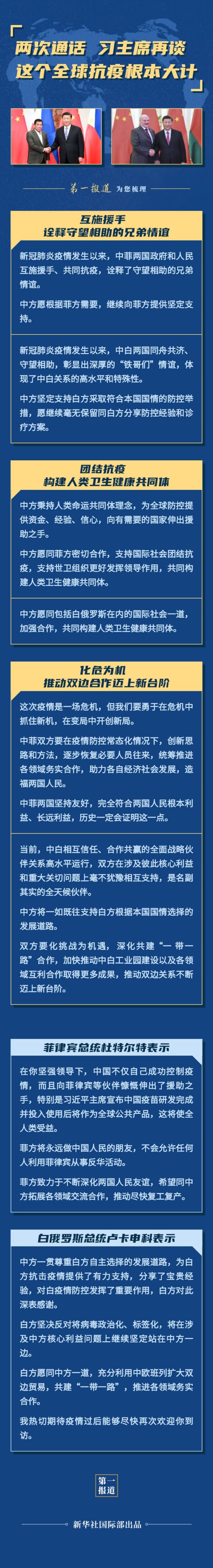 习近平指出,新冠肺炎疫情发生以来,中白两国同舟共济、守望相助,彰显出深厚的“铁哥们”情谊,体现了中白关系的高水平和特殊性。中方坚定支持白方采取符合本国国情的防控举措,愿继续毫无保留同白方分享防控经验和诊疗方案。相信在你坚强领导下,白俄罗斯人民一定能够尽快战胜疫情。感谢白方为在白俄罗斯学习、工作、生活的中国公民提供帮助,相信白方将继续有效保障他们的生命安全和身体健康。中方愿同包括白俄罗斯在内的国际社会一道,加强合作,共同构建人类卫生健康共同体。