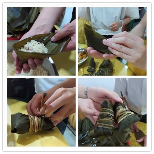 北方人喜甜粽,南方人爱咸粽,在手工粽子制作时,大家互相帮助、互相学习,取出2片粽叶卷成漏斗形状,根据自己的口味喜好选择不同馅料,再取粽叶包裹严实,用秸秆紧紧缠绕、绑紧。有的把粽子做成三角形,有的做成长方形、正方形、球形。最后,工作人员把所有完成的粽子一起放在食堂大锅里煮熟,再分回给员工品尝。每组的手工粽子都各具特色,每人的手工粽子都别有风味。
