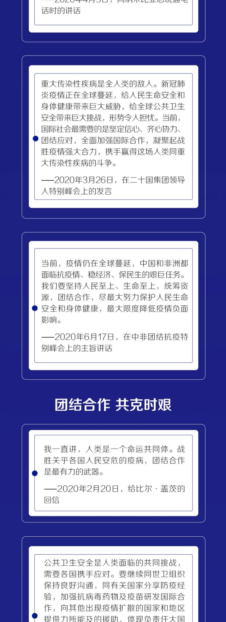 截至目前,习主席就疫情开展的“电话外交”已达60余次,出席二十国集团领导人应对新冠肺炎特别峰会,在第73届世界卫生大会视频会议开幕式上致辞,主持中非团结抗疫特别峰会并发表主旨讲话,不断向全球表明中国支持团结抗疫的鲜明立场。