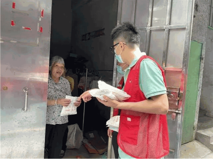 (7月1日,华远公司党支部到东城莲发社区向受灾商户派发消毒粉。)