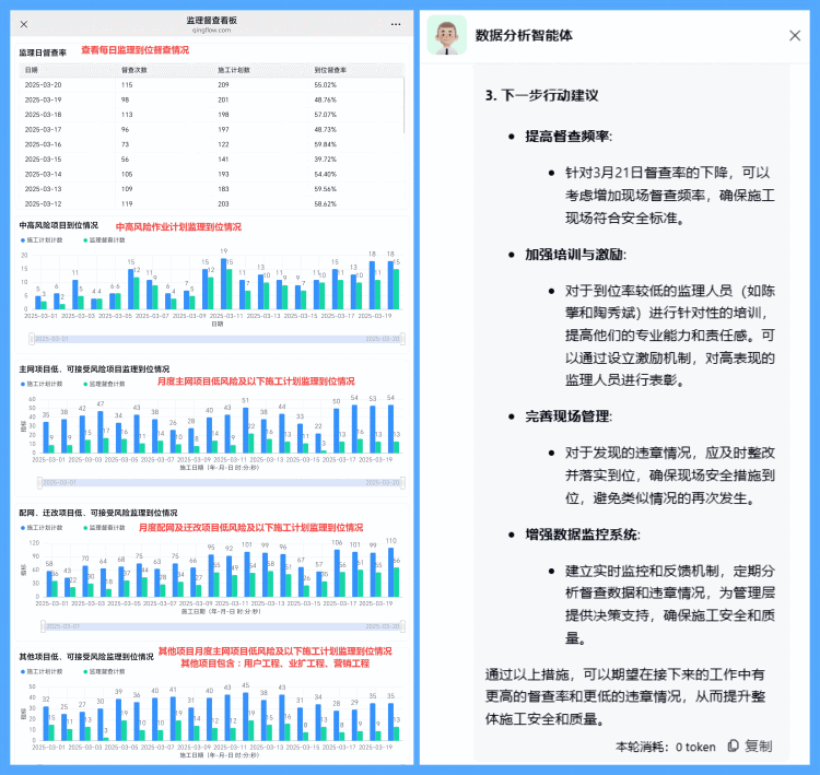 值得一提的是,该系统还引入AI智能体,构建“监测-诊断-治疗”管理闭环,智能分析监理履职缺位原因并提供改进建议,有效为监督管理工作减负,大幅提升安全管理效能,实现从“事后追责”向“过程管控”的转变。
