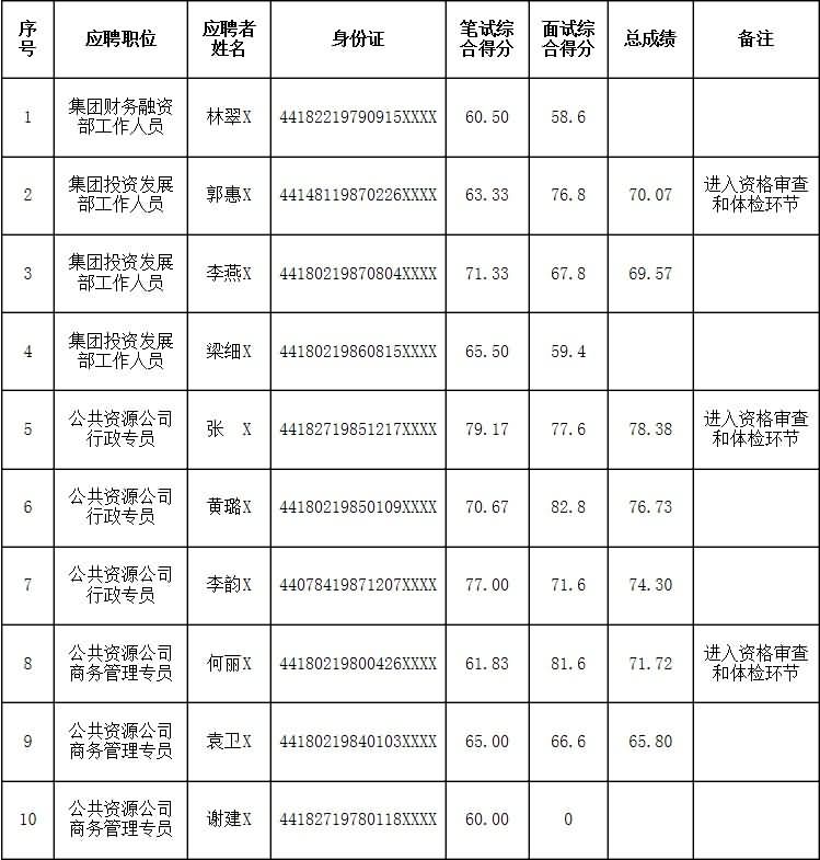 清远市城市建设投资开发集团有限公司(以下简称“集团公司”)和清远市城投公共资源管理有限公司(以下简称“市城资公司”)公开招聘工作人员面试工作已结束,应聘人员面试分数必须达到60分才计算总成绩,具体面试成绩及总成绩公布如下: